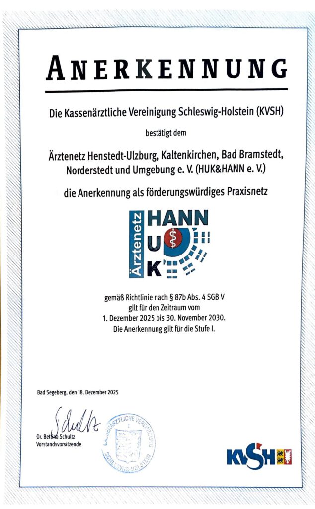 Das Ärztenetz HUK&HANN wurde am 10. November 2020 von der Kassenärztlichen Vereinigung Schleswig-Holstein als förderungswürdiges Praxisnetz anerkannt.